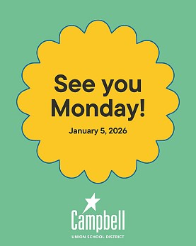 ⛄ Campbell Union School District will be closed December 22 - January 4 for winter break. Enjoy time with your loved ones. 👩🏫 We'll see you January 5th!